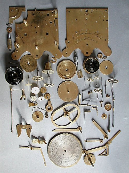 Auftraggeber: Atelier Breidenstein Bild 1: Zifferblatt im restaurierten Zustand. Bild 2: Vorderplatine mit Jahreskalender und Minutenzeigern für mittlere und wahre Zeit. Bild 3: Glockenspiel von Stollenwerck im restaurierten Zustand. Bild 4: Glockenspielwerk im unrestaurierten Zustand. Zustand des Uhrwerks:Bedingt durch die Einwirkungen der Kriegs- und Nachkriegszeit (1945 als Kriegbeute in die Sowjetunion, 1958 Rückgabe an die DDR) war die Uhr in einem teilweise desolaten Zustand. (verstaubt, verkratzt, leichter Ansatz von Flugrost und Grünspan, verharztes Öl mit entsprechenden Ätzungen in den Platinen usw.), manche Wellen verbogen, wesentliche Teile des Schlagwerks mit Ausnahme des Beisatzrads, der Schlossscheibe und des Federhauses fehlten (Hebnägelrad und Trieb, Einfallrad und Trieb, Vorlaufrad und Trieb, Windfang und Trieb, 2 Glockenhalterungen, 2 Hämmer und 2 Glocken).Das Kalenderwerk mit Antrieb vom Schlagwerk war noch vorhanden allerdings verstellt und einige Teile stark verbogen. Die Funktion der Äquation mit 2 Minutenzeigern war außer Kraft gesetzt, indem man ein Rad in dem Differentialgetriebe entfernt hatte, und die 2 Räder der Minutenrohre zusammengenietet waren. Die Achse des Rückholhebels für das zurückspringende Datum war abgebrochen und ein Stück Kette vom Hebel zu der Rolle auf der Rückseite des Zifferblatts war verlorengegangen. ![]() Bild 5: Einzelteile des Werkes nach der Restaurierung. Zustand des Zifferblatts:Das Zifferblatt war ebenfalls stark verstaubt. Der große Ziffernring ist später galvanisch versilbert worden. Wie alle gravierten Anzeigen war er ursprünglich chemisch versilbert. Diese Versilberung, wie z.T. am Jahresrad erhalten, ist durch Lichteinwirkung und unsachgemäßes Putzen verlorengegangen. Der Kontrast des jetzt gesäuberten Zifferrings mit der vergoldeten Grundplatte im Vergleich zu den anderen dunklen Anzeigen (Sekundenring, Signaturplatte Stollewerck, Datum, Mondphase usw.) wirkt etwas befremdlich.Zustand des Spielwerkes:Das Spielwerk war in einem noch schlechteren Zustand als das Uhrwerk. Abgesehen von Korrosion und Staub waren einige Teile stark verbogen und im Falle des Rahmens und der Hammerleiste verzogen.Der Wechselmechanismus war ebenfalls verbogen und Stifte an der Wechselscheibe waren abgebrochen. Einige Hämmer waren abgebrochen, zwei Glocken sind im Laufe der Zeit verloren gegangen und waren durch falsch klingenden Glocken ersetzt worden. In der Glockenspielwalze waren manche Stifte verbogen und andere abgebrochen. (s. Bild unten) ![]() Bild 6: Glockenspielwalze, Zustand vor der Restaurierung. Ausgeführte Arbeiten:Werke total zerlegt, gereinigt, elektrolytisch entrostet.Zapfenpolitur, Überholung der Lager. Ergänzung fehlender Teile im Räderwerk des Schlagwerkes vom Hebnägelrad bis zum Windfangtrieb. (Die Räder wurden aus einer speziellen Messinglegierung geschnitten, die dem Farbton alter Messinglegierungen entspricht.) Ergänzung des Zeigerwerkes für die Anzeige der wahren und mittleren Zeit, Anfertigung beider Minutenzeiger. Anfertigung der Schlagwerkshämmer, Ergänzung der Glocken für Viertel- und Stundenschlag, Auslösung des Spielwerkes. Spielwerk: Räderwerk ergänzt (Kronenrad neu angefertigt, fehlender Windfang und Trieb rekonstruiert. ![]() Bild 7: Neu angefertigte Räder des Schlagwerkes. ![]() Bild 8: Hammerwerk, fehlende Hammerköpfe ergänzt. In Cooperation mit dem "National Museum from Musical Clock to Street Organ" Niederlande wurde die Tonfolge der Glocken neu bestimmt und fehlende Glocken ergänzt. Restaurierung und Konservierung des Zifferblatts in Absprache mit der SPSG. Konservierung aller Metallteile.